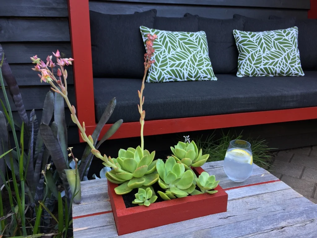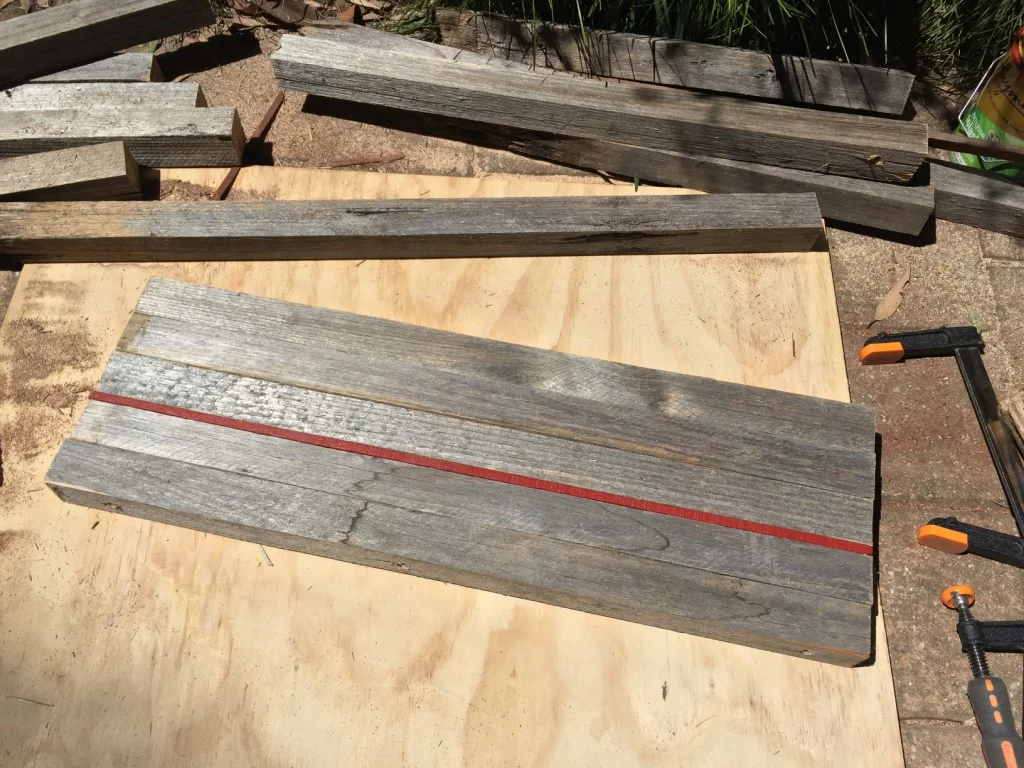 Then Steven has a mid-project bright idea. This often happens. Not only will the table have a small red inbuilt box for plants to match the garden, but it will also have some red painted timber slithers in between the old weathered timbers. Steven is very happy with this idea and proceeds.