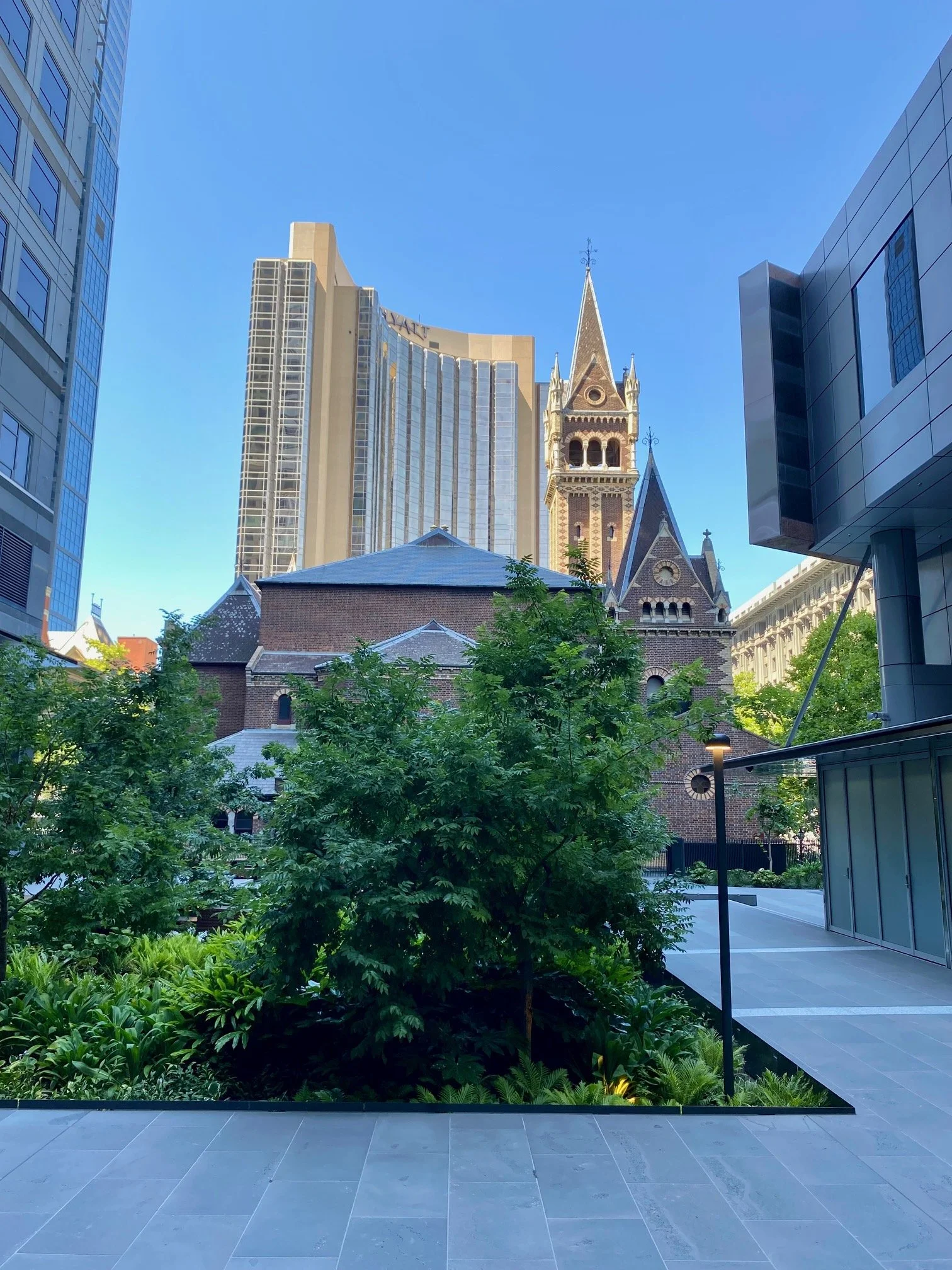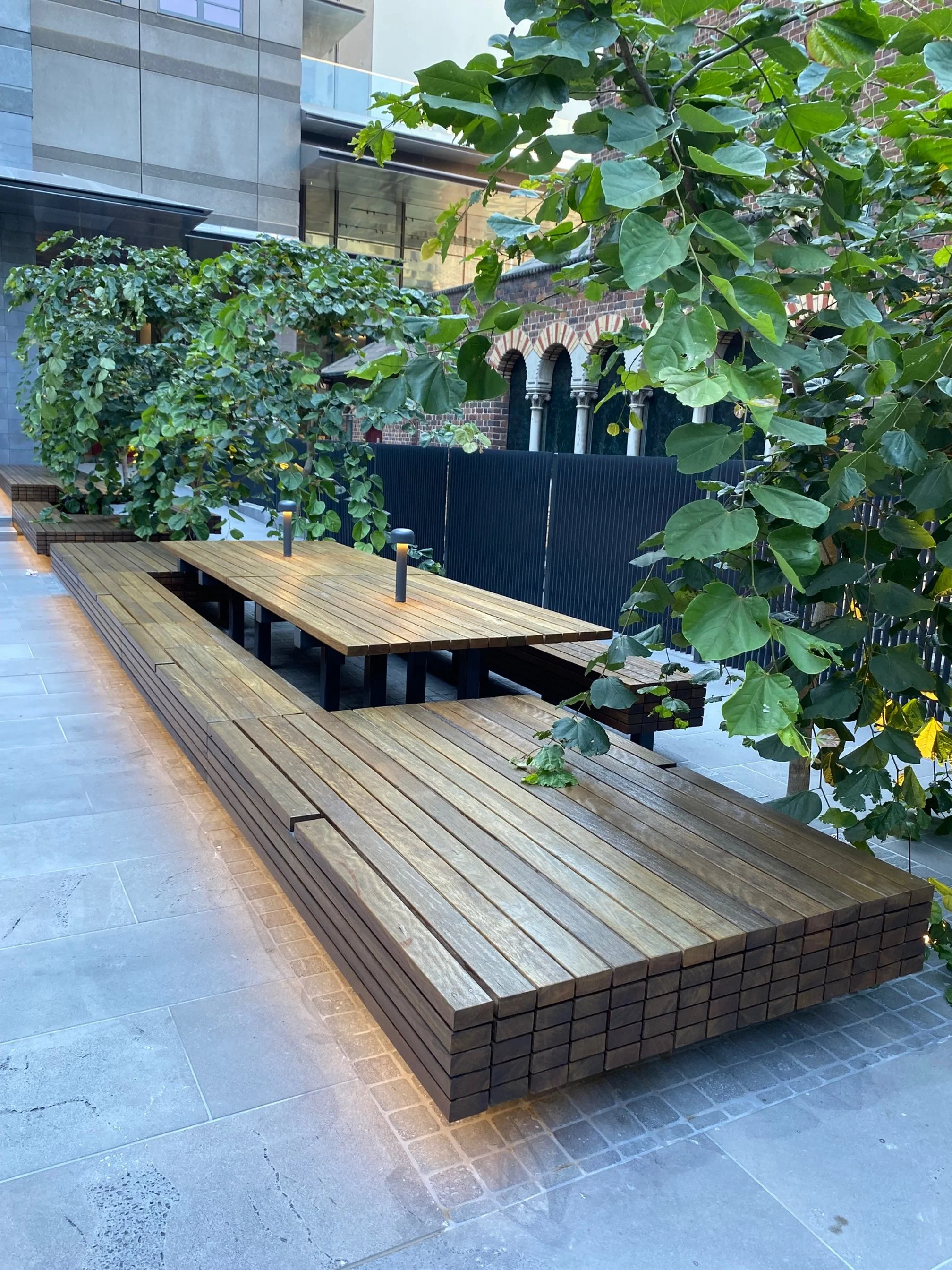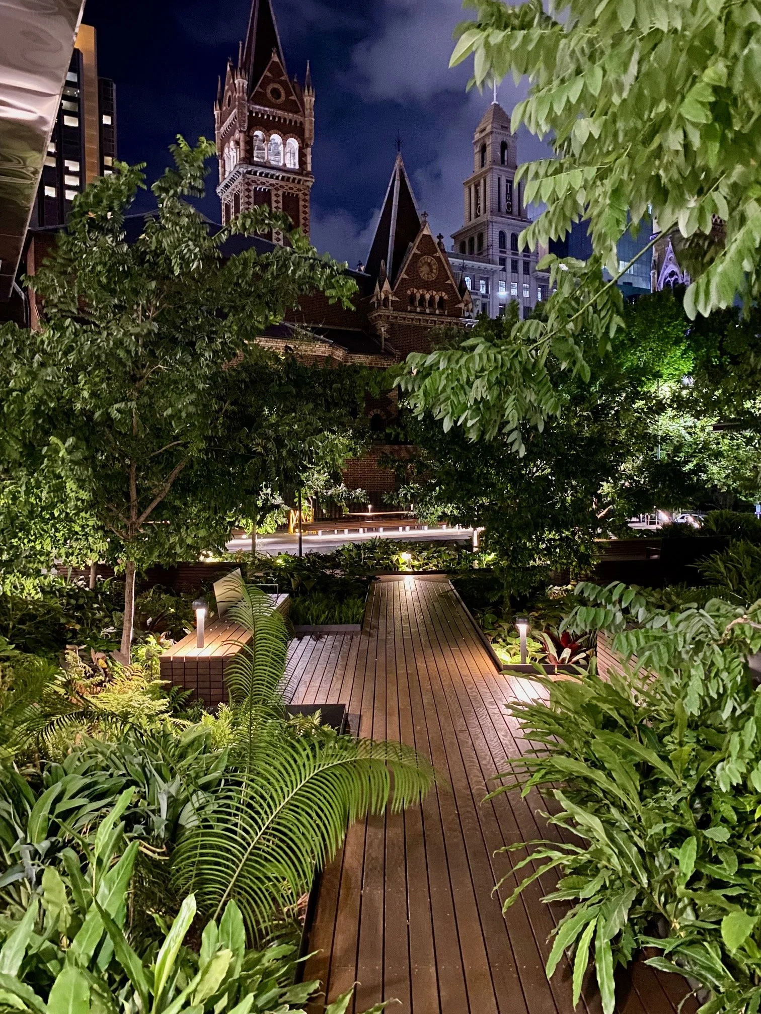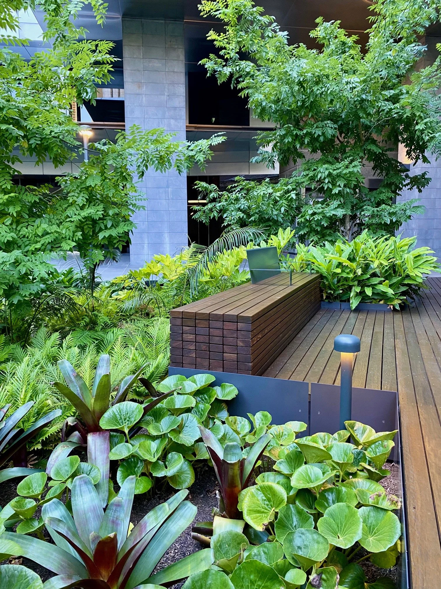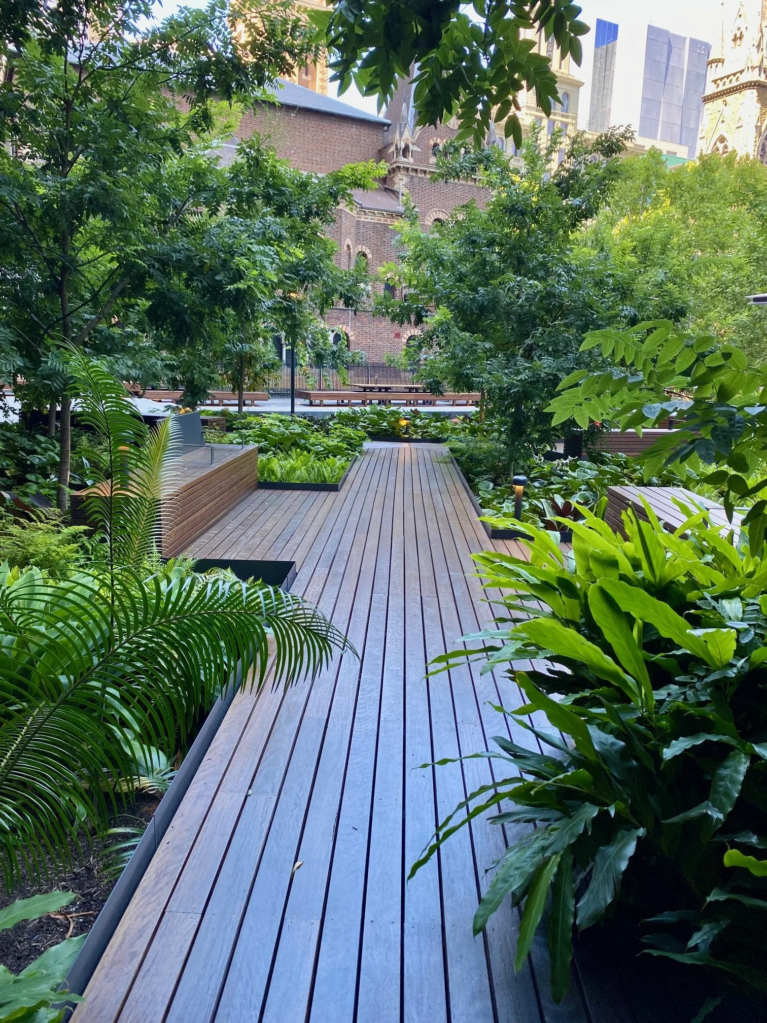 A beautiful lush plant filled open courtyard space that is predominantly shaded and located behind St Michael’s Uniting Church. I love the decking paths and seating pockets and density of planting which provides enough spacing between seating spaces that you can enjoy some quiet solitude while amongst this thoroughfare courtyard. The timber bench shared tables also look great and I’m looking forward to seeing the canopy growing over the tables.