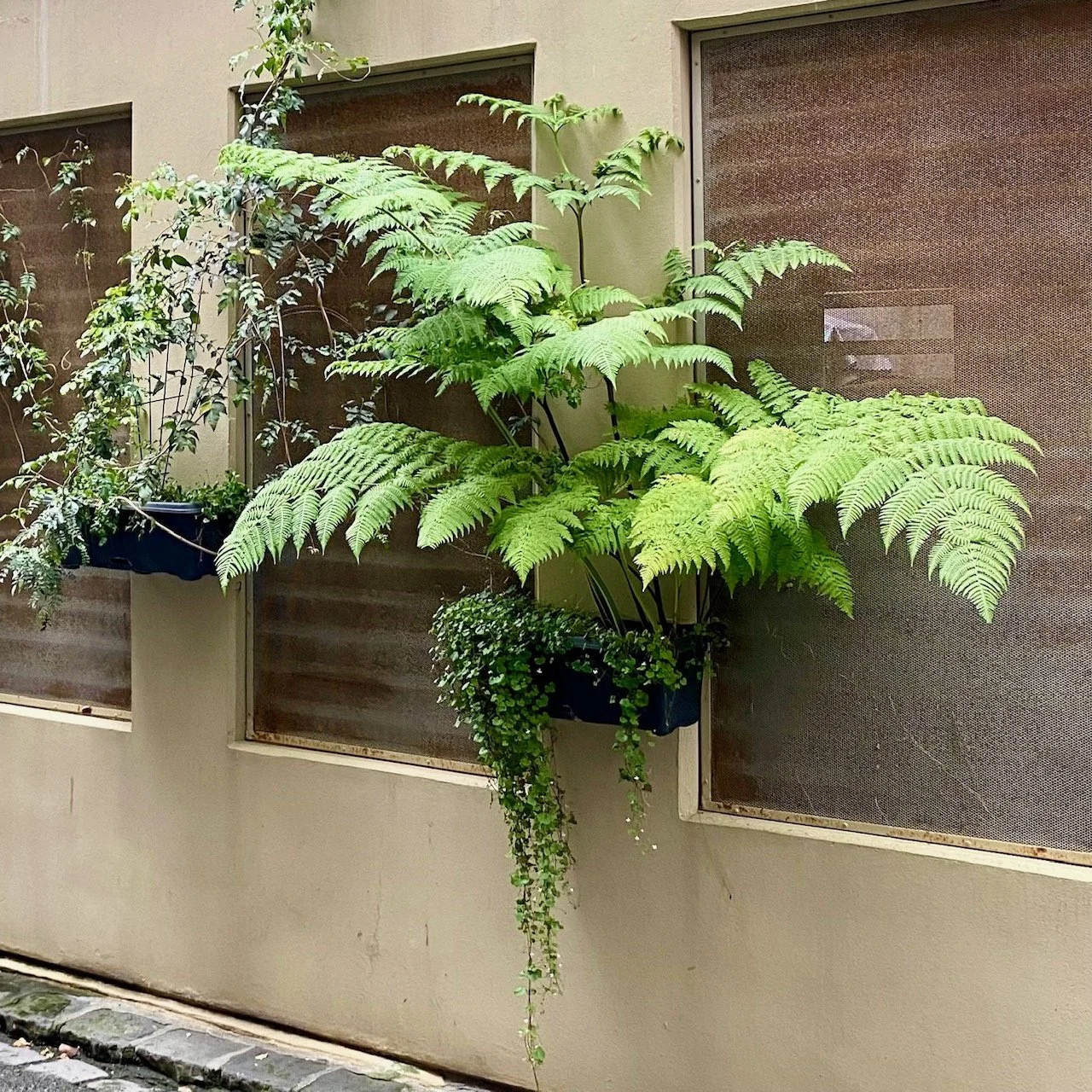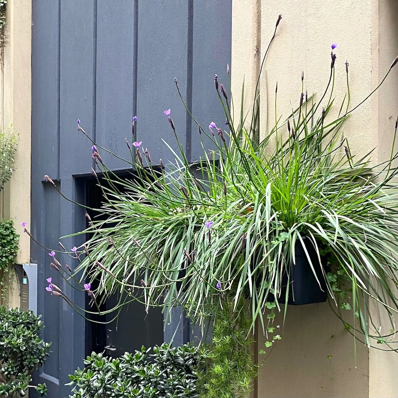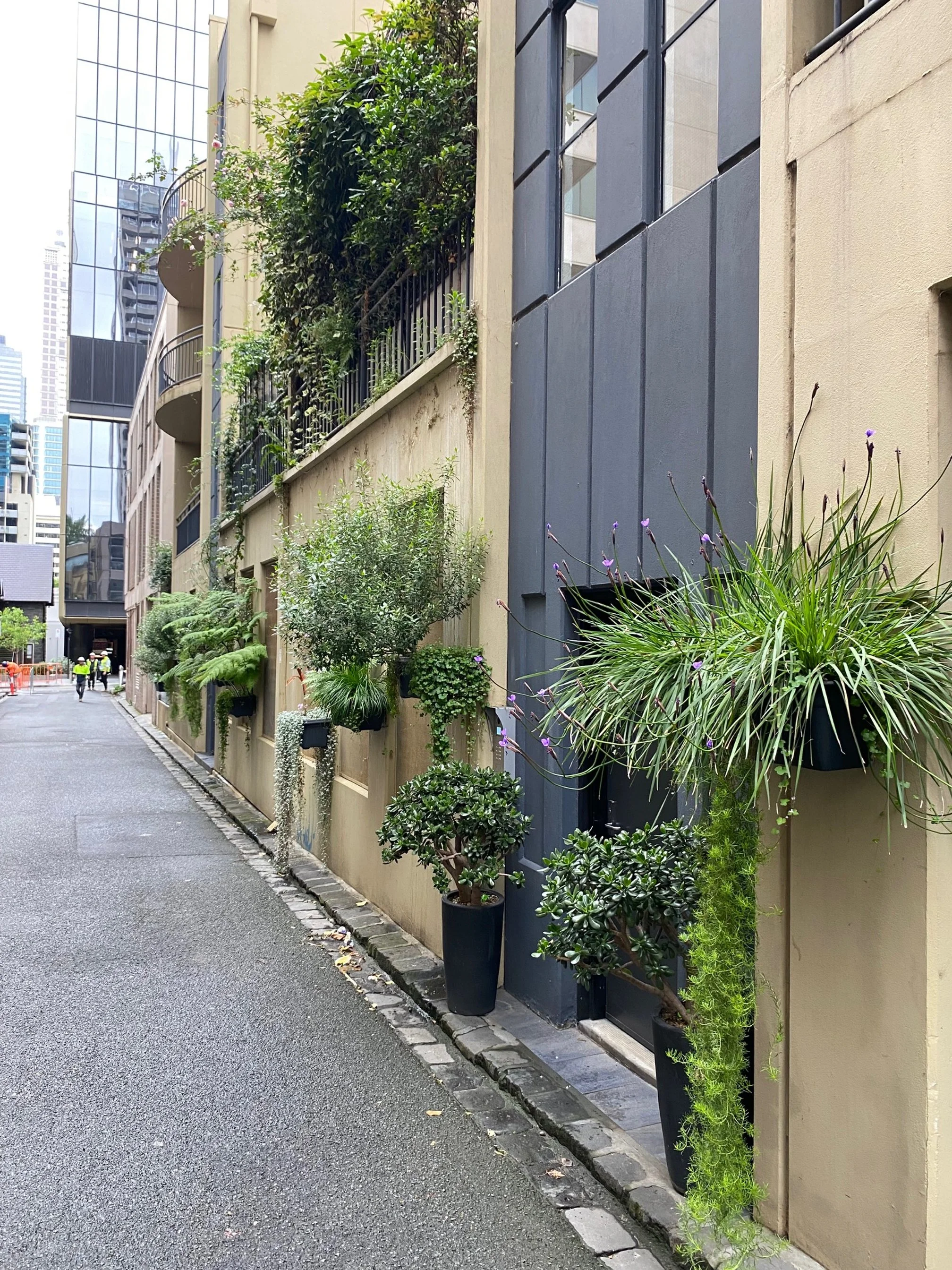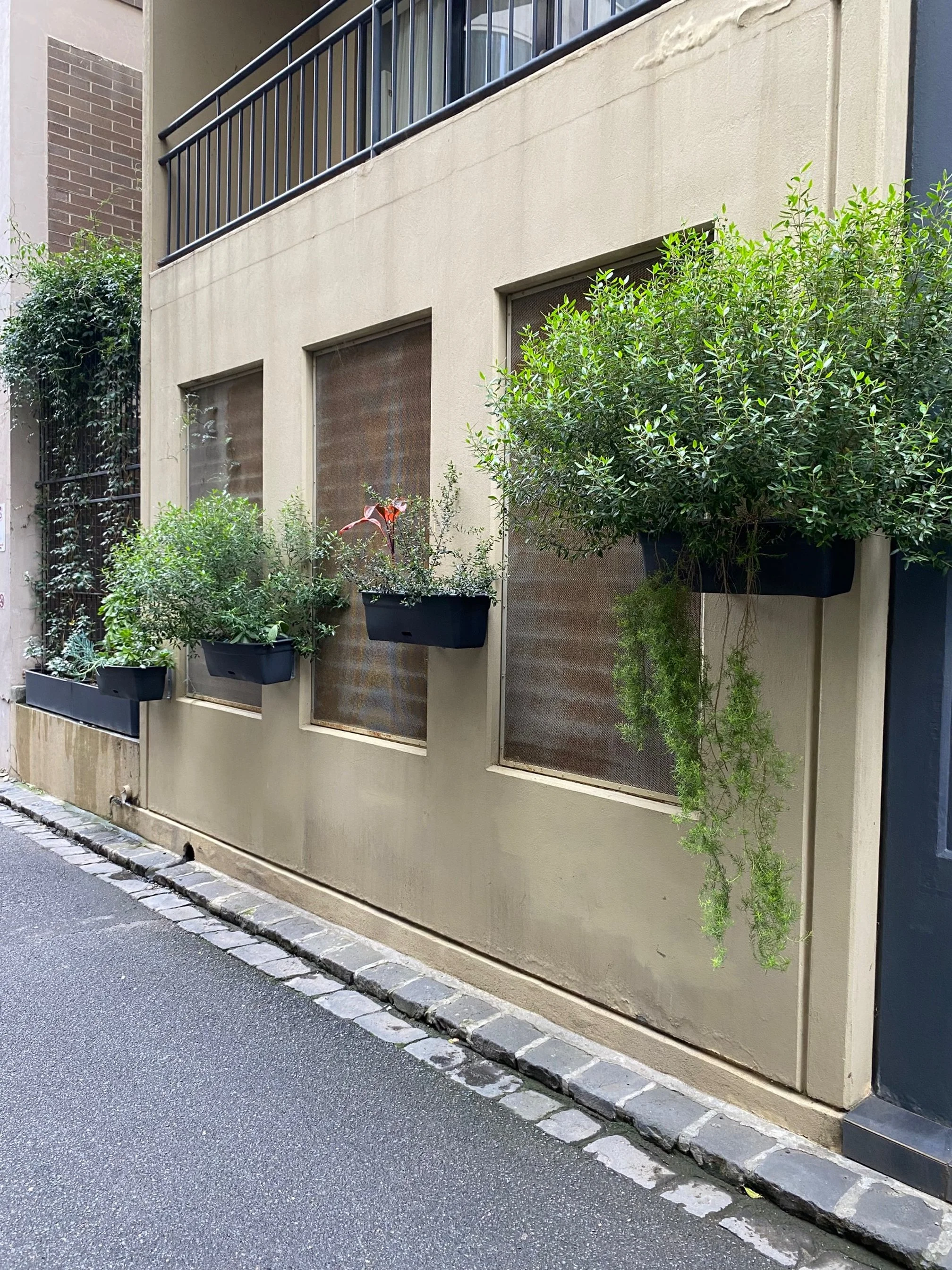 A delightful small pocket of potted greenery is growing very successfully in wall planters. I was amazed to see how well the Purple Flag, fern and Correa are growing in these small wall planters. It’s predominantly a shaded alley wedged between taller buildings so doesn’t get much direct sunlight.